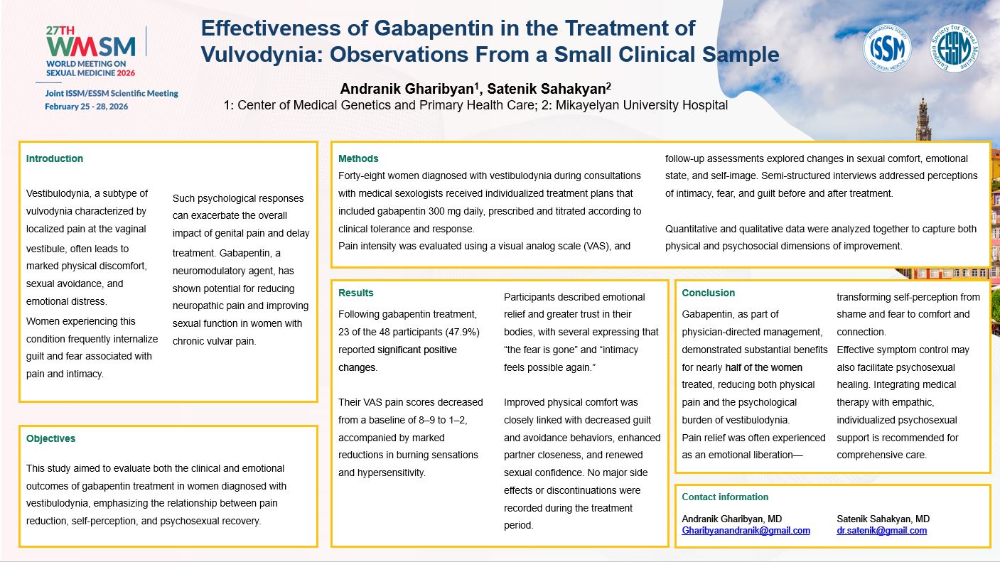 և բժիշկ-սեքսոլոգներ Ա․ Ղարիբյանի ու Ս․ Սահակյանի կողմից կատարված աշխատանքի համառոտագիրը՝ «Գաբապենտինի արդյունավետությունը վուլվոդինիայի բուժման մեջ. դիտարկումներ փոքր կլինիկական նմուշում»: